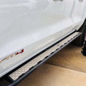 Steps with aluminum tread plates assist in entering and exiting the vehicle