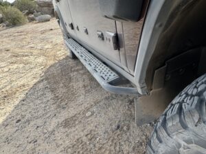 Steps with aluminum tread plates assist in entering and exiting the vehicle.