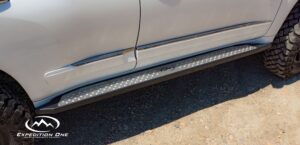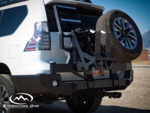Optional Expedition One signature Smooth Motion Tire Carrier System allows carrier to swing in unison with the door